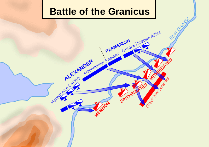 The Battle of the Granicus was the first major engagement between Alexander III the Great commanding his army of Macedonians, Greeks, and Thracians facing off with the vast armies of the Achaemenid Empire under the high command of Darius III. During this engagement the Persian forces would be lead by general Memnon would be defeated by the combined assault of Alexander.